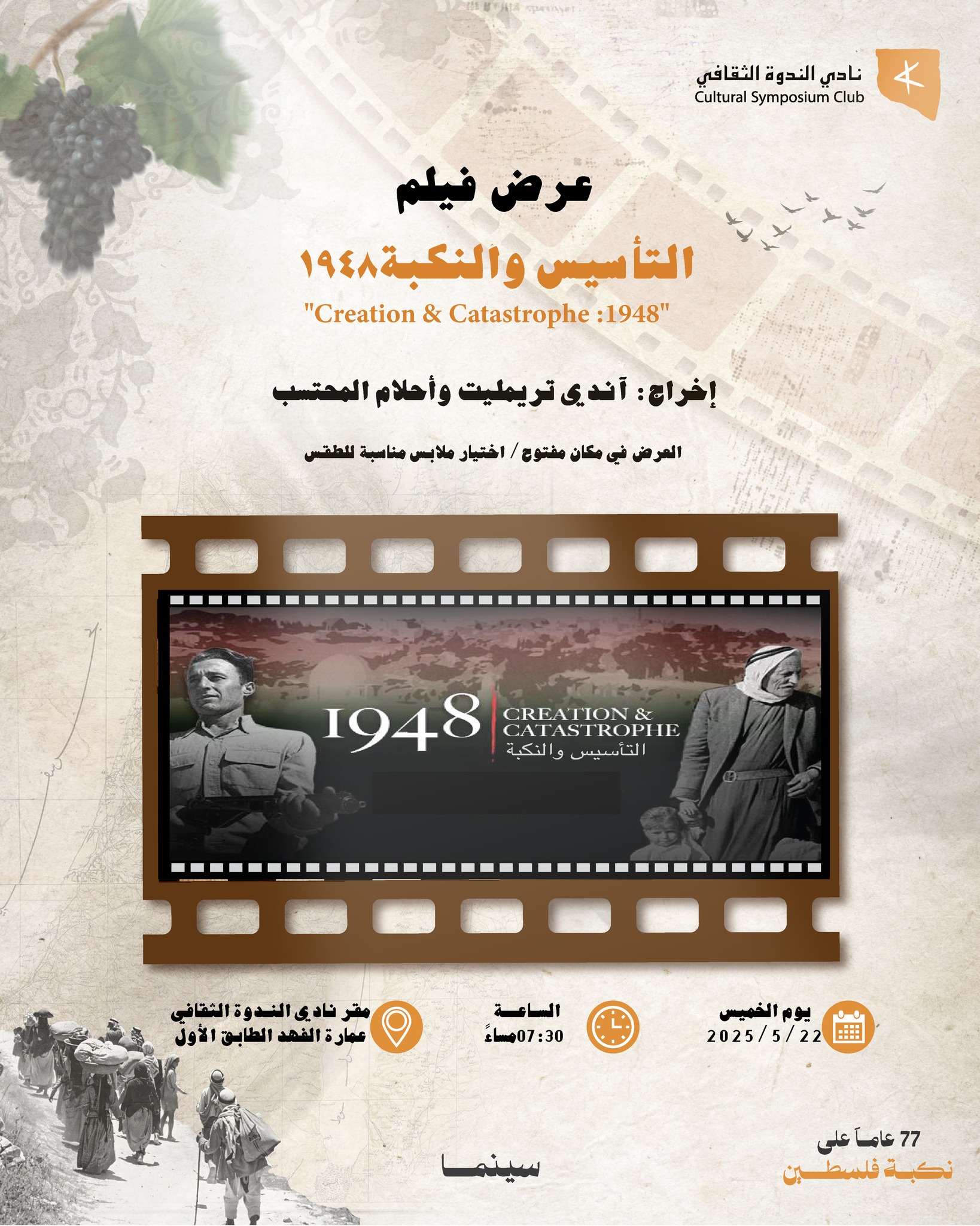 ضمن فعاليات نكبة فلسطين 1948، ندعوكم لحضور عرض الفيلم الوثائقي: "١٩٤٨: التأسيس والنكبة" "1948: Creation & Catastrophe" للمخرج الأمريكي " آندي تريمليت" والمخرجة الفلسطينية أحلام المحتسب وذلك يوم الخميس الموافق 22 أيار 2025 في تمام الساعة 7:30 مساءً Cultural Symposium Club invites you to attend the screening of the Documentary Film Directed by Andy Trimlett and Co-Directed by Ahlam Muhtaseb: "1948: Creation & Catastrophe" 7:30 pm on Thursday, may 22th, at Cultural Symposium Club, Hebron ___________________________________________________________________ ملخص الفيلم: من خلال إثارة وتجميع الذكريات الشخصية للذين عايشوا نكبة الـ ١٩٤٨، يكشف فيلم " ١٩٤٨: التأسيس والنكبة" عن الأحداث المروعة التي وقعت في هذا العام والذي يعد الأكثر أهمية في الصراع والأكثر إثارة للجدل في العالم. يحكي الفيلم قصة قيام إسرائيل كما ترى من خلال أعين الناس الذين عاشوها. ليس من الممكن ببساطة فهم ما يحدث في الصراع الإسرائيلي الفلسطيني اليوم دون فهم ما حدث في عام 1948. كما وقد مثل هذا الفيلم الوثائقي الفرصة الأخيرة للعديد من شخصياته لرواية رواياتهم المباشرة عن إنشاء دولة وتهجير أمة... Film Synopsis: Through riveting and moving personal recollections of both Palestinians and Israelis, 1948: Creation & Catastrophe reveals the shocking events of the most pivotal year in the most controversial conflict in the world. It tells the story of the establishment of Israel as seen through the eyes of the people who lived it. It is simply not possible to make sense of what is happening in the Israeli-Palestinian conflict today without an understanding of 1948. This documentary was the last chance for many of its Israeli and Palestinian characters to narrate their first-hand accounts of the creation of a state and the expulsion of a nation