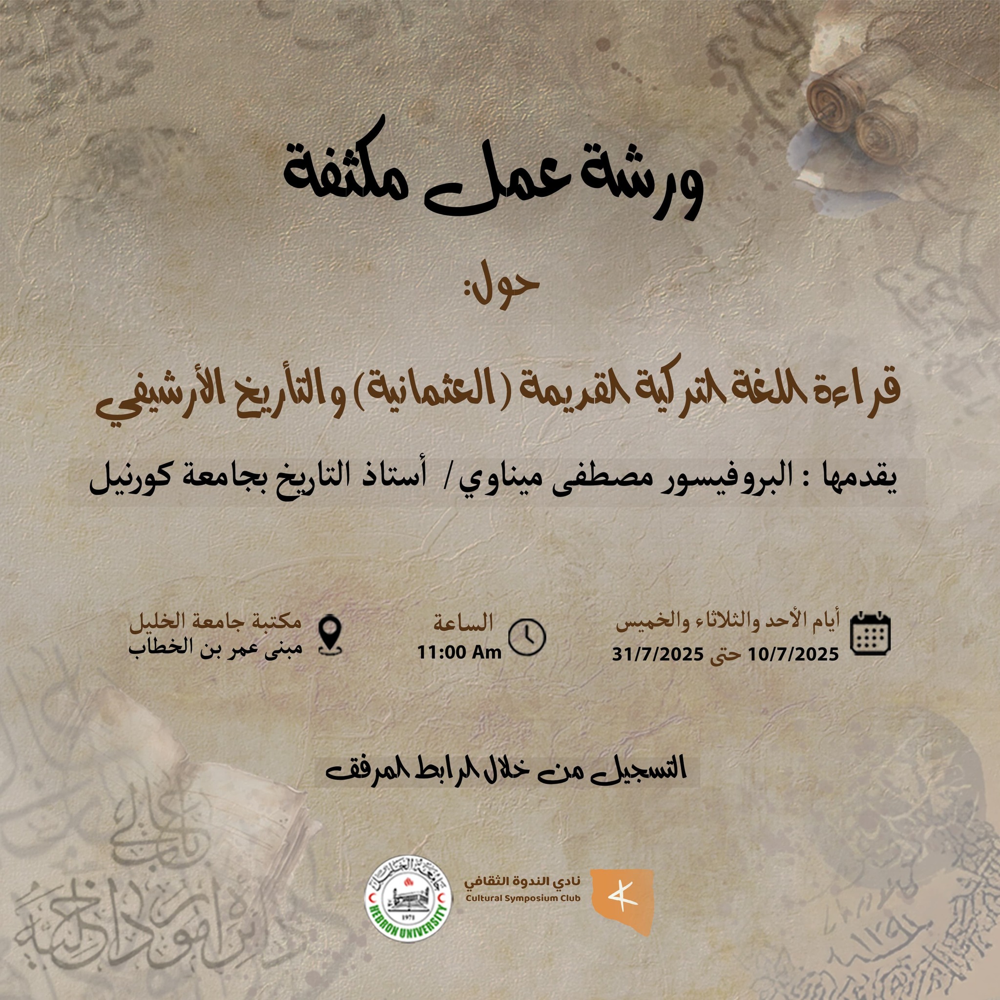 يدعوكم نادي الندوة الثقافي بالشراكة مع جامعة الخليل، للمشاركة في ورشة عمل المكثفة حول: (قراءة اللغة التركية القديمة والتأريخ الأرشيفي) التي سيقدمها البروفيسور مصطفى ميناوي/ أستاذ التاريخ بجامعة كورنيل، من تاريخ 10/7/2025 حتى 31/7/2025، أيام الأحد والثلاثاء والخميس، الساعة 11:00 صباحًا في مقر مكتبة جامعة الخليل.