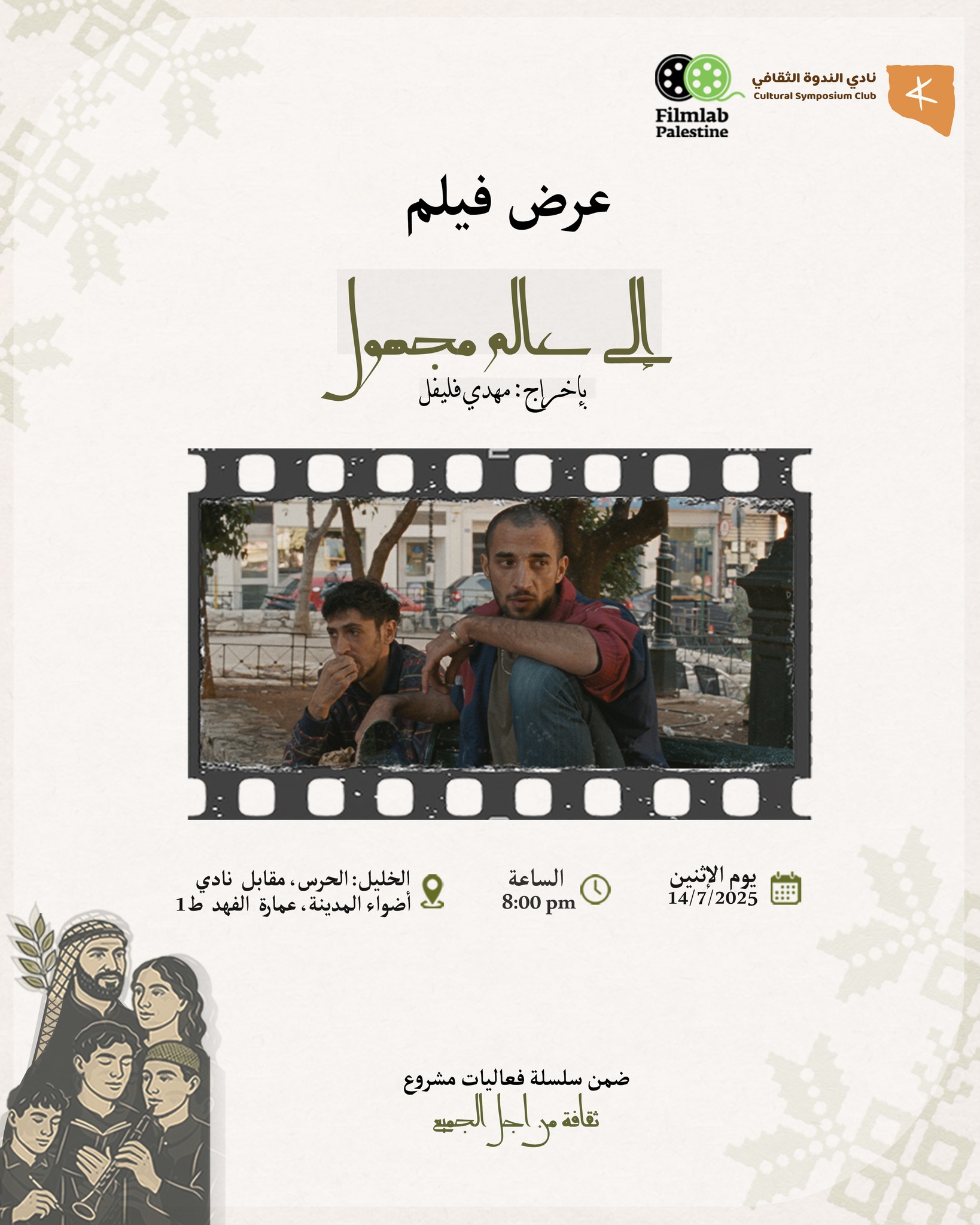 جانب من عرض فيلم “إلى عالم مجهول” يوم أمس الاثنين الموافق 14\7\2025 للمخرج مهدي فليفل، بالشراكة مع فيلم لاب، وضمن فعاليات مشروع ثقافة من أجل الجميع. يروي الفيلم قصة المحاولات اليائسة لاثنين من أبناء العم الفلسطينيين الذين تقطعت بهم السبل في أثينا لإيجاد وسيلة للوصول إلى ألمانيا. يدخر شاتيلا ورضا المال لدفع ثمن جوازات سفر مزورة للخروج من أثينا. عندما يخسر رضا أموالهما التي حصلا عليها بشق الأنفس بسبب إدمانه للمخدرات، يخطط شاتيلا لخطة متطرفة تتضمن التظاهر بأنهم مهربين وأخذ رهائن في محاولة لإخراجه هو وصديقه من بيئتهما اليائسة قبل فوات الأوان