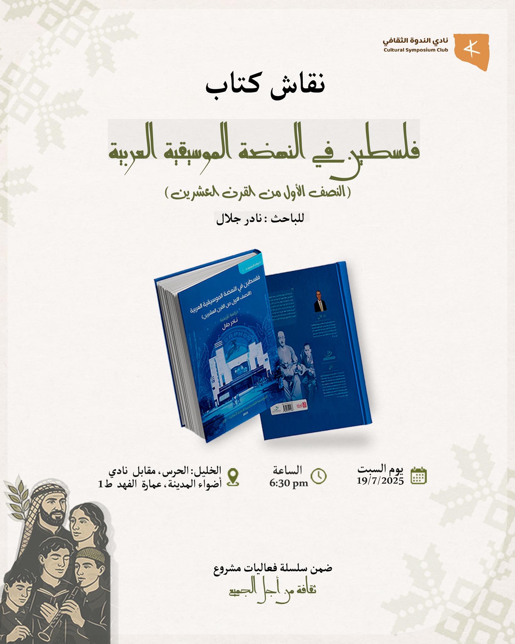 نقاش وتوقيع كتاب (فلسطين في النهضة الموسيقية العربية: النصف الأول من القرن العشرين) للباحث نادر جلال.