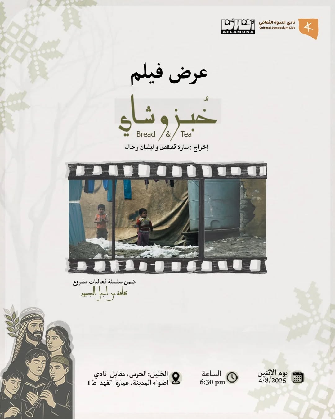 كونوا ا معنا يوم الاثنين 4\8\2025 الساعة 6:00م في عرض فيلمي (صبري) للمخرجة فرح شيا، و (خبز وشاي) للمخرجتان سارة قصقص وليليان رحال، بالشراكة مع المؤسسة الفلسطينية للتنمية الثقافية (نوى)، ومنصة أفلامنا. “صبري” يسلط الضوء على إنجازات صبري الشريف، ويستعرض شهادات شخصيات بارزة عاصرته وتعاونت معه، مثل نضال الأشقر، بابو لحود، ونجله منجد الشريف، وغيرهم. يقدم الفيلم لمحة عن حياة الشريف ودوره الكبير في تطوير الموسيقى والمسرح الغنائي في لبنان وفلسطين. " خبز وشاي " يعيش محمد، لاجىء سوري في التاسعة من عمره، في مخيّم مؤقت على الحدود مع لبنان. إنّه الأخ الأكبر في عائلة مكوّنة من 5 أولاد. الأب مفقود والأم غائبة؛ ينقسم محمد بين صفته كطفل ودوره كمعيل لعائلته.