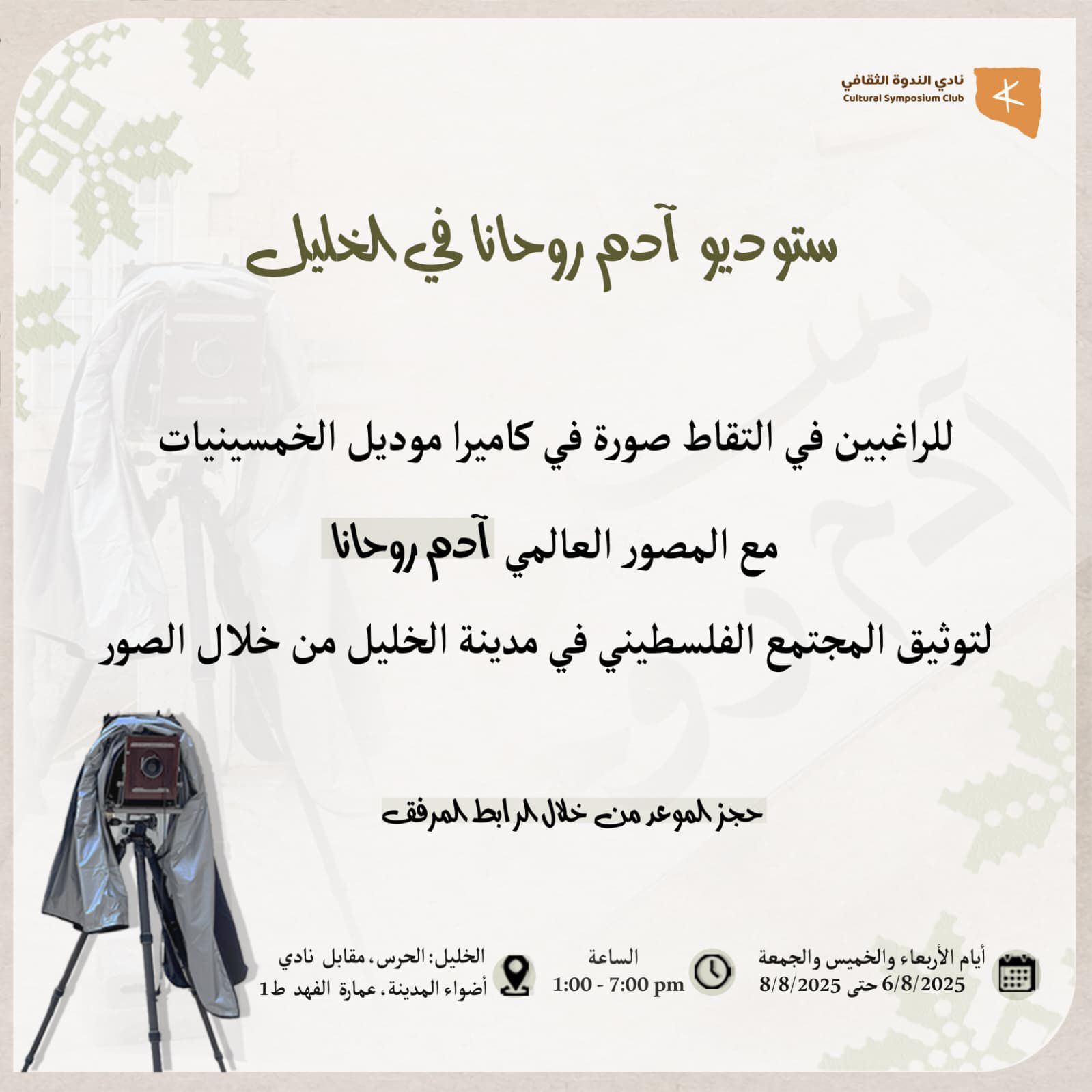 تهدف هذه الجلسة التي تستمر لثلاثة أيام من يوم الأربعاء حتى الجمعة 6-8/8/2025، لتوثيق ثقافة مدينة الخليل من خلال الصورة، لتسليط الضوء من خلالها على هويتها التراثية والبصرية، وتشمل جلسات التصوير التقاط صور لمجموعة من أفراد جبل الخليل وهم يرتدون ملابس المنطقة التراثية والحرفية ليتم وضعها لاحقًا في كتاب يتناول هوية المدينة، الاولوية في الحجز لكبار السن والحرفيين والذين يحملون في مظهرهم هوية بصرية متميزة في المدينة لازالوا متمسكين بها.